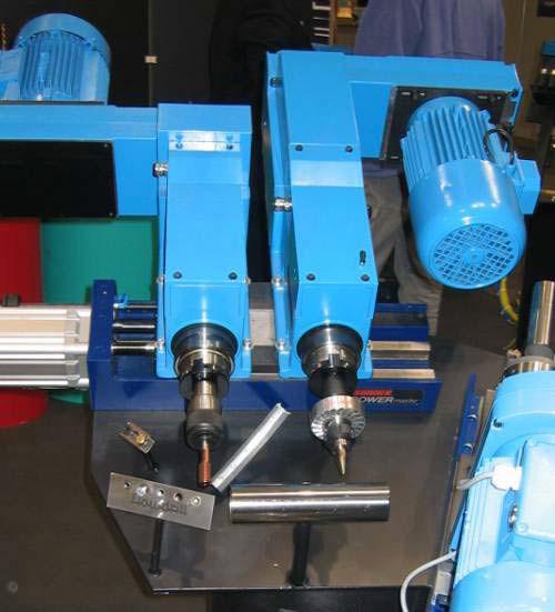 ● Forming of the bush ● Collar shaped according to the tool type. Either as an edge in the form of an O ring or as a plane surface. This bush made without chips in seconds can be used as a bearing, as a load bearing soldered or welded connection, or of course as a core hole sleeve for screw unions. In contrast to other processes, fdrilling induces material hardening for high tightening torques in threads and large load bearing capacities in bearing bushes. Flow drilling tools are available for diameters of 1.5–46.0 mm. SUHNER can offer for this work a range of drilling units with various feeding systems. The classical flow drilling units are the BEM 12 and the BEM 20, each with pneumohydraulic feed, i.e. a pneumatic feed regulated with a hydraulic cushioning cylinder. The following series of operations are implemented in practice. 1. The spindle moves the rotating flow drill in rapid traverse directly in front of the workpiece. 2. Now under regulated, but still rapid feed, the tool tip contacts the workpiece. 3. Under the action of friction, the material glows and starts to flow. 4. The feed movement, first obstructed by the contact, now continues, i.e. the spindle presses the flow drill through the material. The characteristic collar is formed.