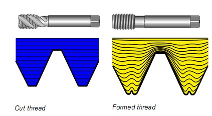 Owing to the displacement the material is forced to flow. This gives rise to a compressed thread profile. When the threads are formed, their highest points are pressed into the material. The material is deformed and flows into the gaps between the thread former's teeth. There are no chips. As a comparison: The structures of a closed and formed thread