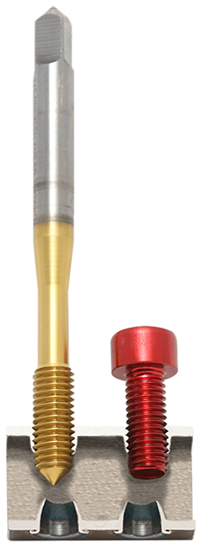 Ftapping a Thread Once a bushed hole has been formed in a workpiece, it's quite likely that you'll want to tap a thread into it. This can be done using conventional cutting taps or - preferably - with a cold-form Flowtap. Ftapping is very similar to the Fdrill process, except the helical cut tip requires significantly less drill speed (and therefore develops less heat!). Again - because this process does not involve removal of material - Ftapping results in maximum thread wall strength. Other advantages include quick tapping speed, reduced chance of pitch errors and no straying material (which is handy if you're tapping into something that's sealed). A large range of thread sizes is available. These come in metric, BSB and US thread types.