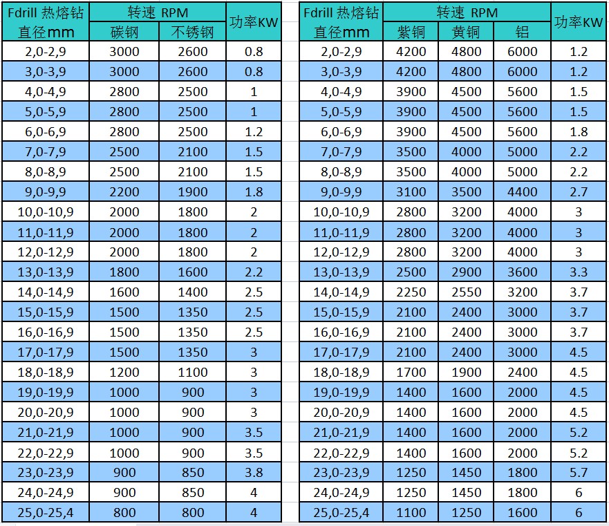 熱熔鉆加工不同材料的功率和轉(zhuǎn)速選擇表